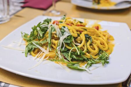 Italian pasta with vegetables, pumpkin and arugula, close up shot