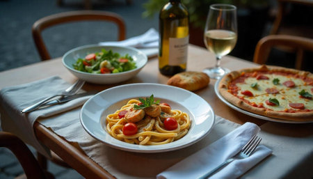 Enjoy a picturesque Italian street scene featuring mouthwatering pizza and pasta dishes served outside a charming caf