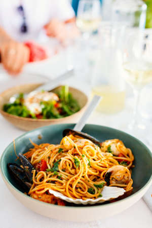 Delicious seafood spaghetti served with white wine for lunch or dinner in restaurant