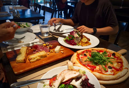 Pizza and pasta on a table in the restaurant. Generative AI illustration