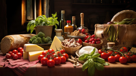 A beautiful arrangement of fresh basil, ripe tomatoes, spaghetti, and a jar of sauce on a rustic wooden surface, showcasing the essence of Italian cooking.