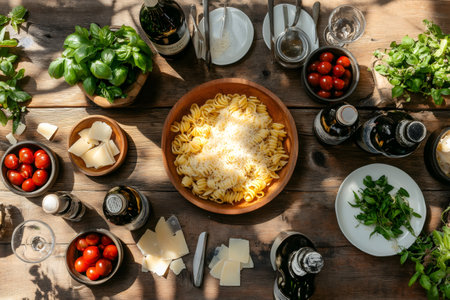 Overhead view of ingredients for a pasta dish, including grated parmesan, fresh basil, cherry tomatoes, and bottles of olive oil and wine, arranged on a rustic wooden table