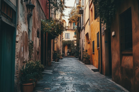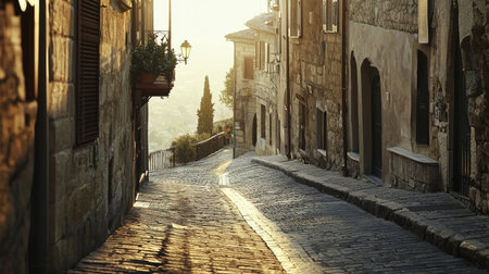 A narrow cobblestone street bathed in warm sunset light, showcasing the charm of a historic town. Perfect for travel and scenic photography.