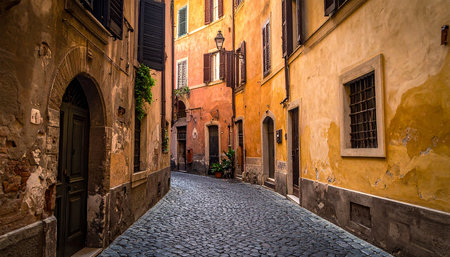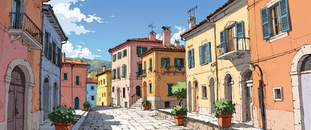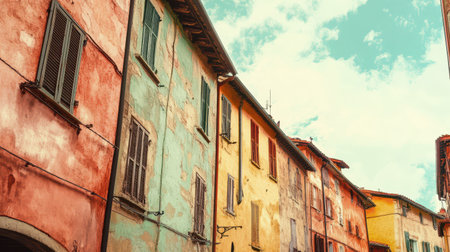 Charming buildings line a narrow street in an Italian village with vibrant colors and rustic textures under a bright sky.