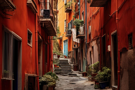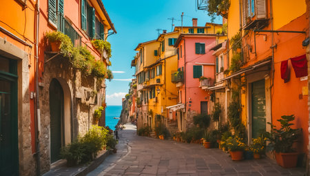 AI Generated. A colorful town street in old Italian town with colorful houses View of a traditional European street from a distance with stone paved roads, laundry on balconies with flower decorations,
