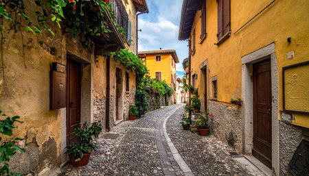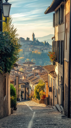 Bergamo's charming cobblestone streets wind down towards the hilltop Citt Alta, framed by beautiful landscapes and medieval architecture, reflecting the town's historical significance.