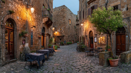 An image captures a cobblestone street bordered by aged stone buildings and illuminated by warm artificial light. The composition features a symmetrical perspective, with visible tables and chairs. The scene evokes a tranquil ambiance, potentially suitable for travel or cultural-themed publications and visual communication.
