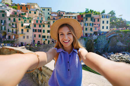 Smiling tourist girl taking selfie photo on sunny day in Riomaggiore village, Cinque Terre, Italy