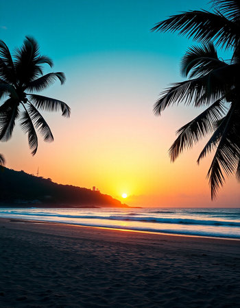 Beautiful sunset on the tropical beach with palm trees and sand.
