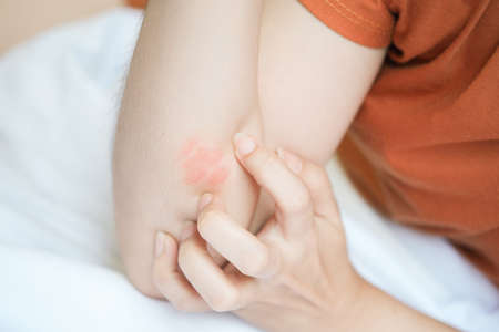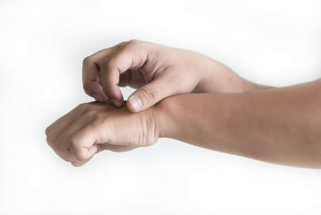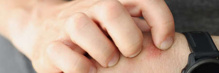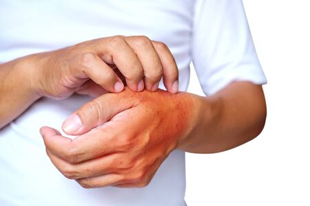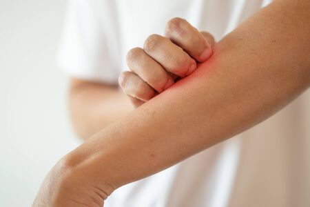 Health care concept. Itching of skin diseases in men using the hand-scratching. Red around the Itching area.