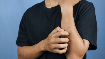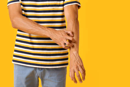 man itching and scratching on arm from itchy dry skin eczema dermatitis