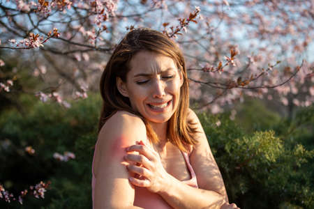 Pretty young woman scratching arm beside blooming tree in park in spring. Redness and itchy skin as allergic reaction