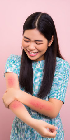 Young Asian woman smiling through discomfort while scratching a red, itchy rash on her forearm, showing sensitive, inflamed skin and dermatology concern on pink background