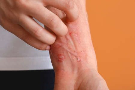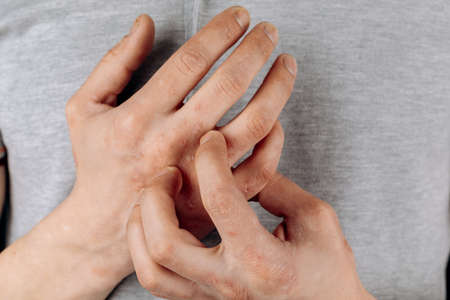 Man scratch oneself, dry flaky skin on hand with psoriasis vulgaris, eczema and other skin conditions like fungus, plaque, rash and patches. Autoimmune genetic disease.