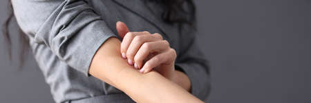 Young woman scratching her itchy hand. Concept skin problem, allergy and dermatology