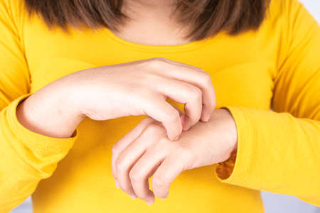 Female scratching her hand on white background with copy space. Medical, healthcare for advertising concept.