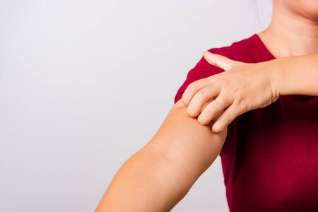 skin problem and beauty. Young woman scratch body has itchy skin from skin allergic, steroid allergy, sensitive skin, red from sunburn, chemical allergy, rash, insect bites, Seborrheic Dermatitis.
