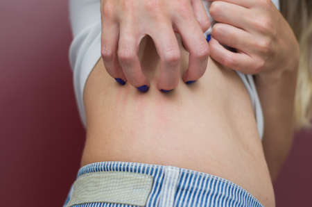 Great concept of allergy and skin diseases, young woman scratching herself.