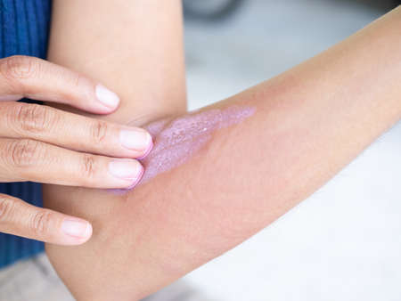 Woman hands lubricate damaged, allergy skin on the back by healing ointment. Psoriasis and other skin diseases