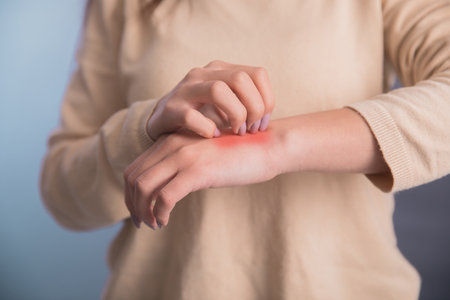 Woman scratch their itchy arm with their hand. Hand food allergy. Itchy hand with tiny red pimples