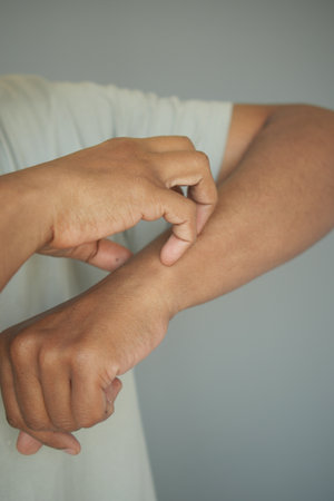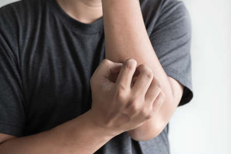 Men feeling itchy and scratching on his arm.