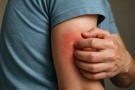 Man hand scratching a prominent red, inflamed patch on his upper arm, indicating an allergic reaction, eczema, or skin irritation. close up view of the affected area.