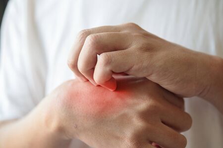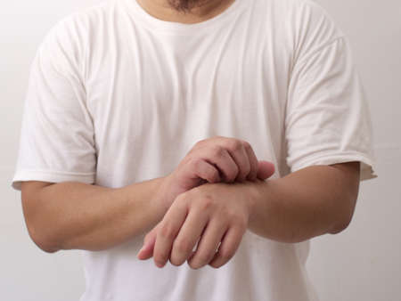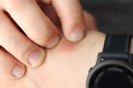 Man scratches red spot on wrist closeup