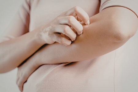 Woman scratch their itchy arm with their hand. Hand food allergy. Itchy hand with tiny red pimples