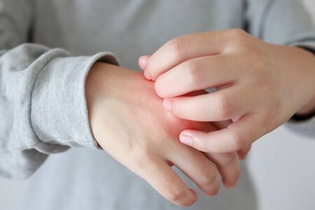 eczema dermatitis on hands and feet. red spots on the skin. dry skinThe concept dermatology, treatment fungal. woman scratching her hand.