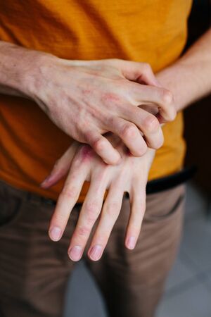 Closeup men itching and scratching by hand. Psoriasis or eczema on the hand. Atopic allergy skin with red spots