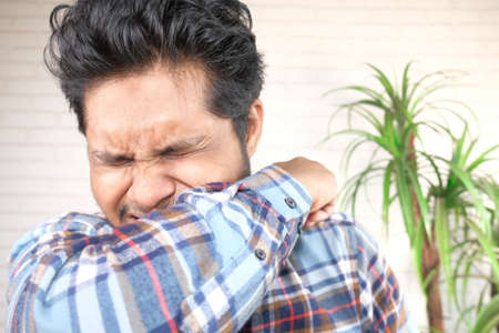 Young ill man covering her nose and mouth with arm.