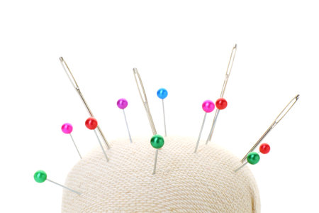 Pincushion with needles and pins on white background. Sewing accessory