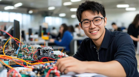 An Asian man with glasses smiles while working on electronics in a lab setting. Wires and circuits are in the foreground.