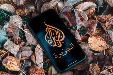 Tallinn / Estonia - September 28, 2020: Black iphone with logo of news media Al Jazeera on the screen. Falled leaves background. Can be used as illustrative for marketing or business concept