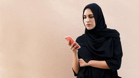Arabic girl texting on her mobile phone smiling wearing hijab Abaya