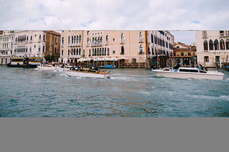 Tourists on the waterfront in Venice, against the background of the ancient facades of buildings standing in water. Water sightseeing in Venice, Italy.
