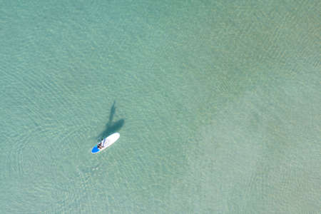 Aerial photo of man on sup board in clear blue sea