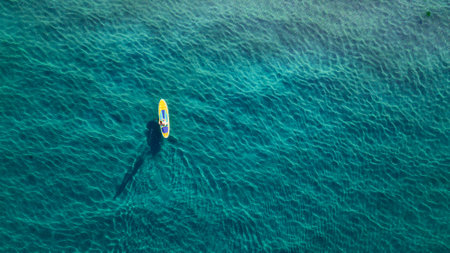 Aerial view of a sportsman paddle boarding in calm, crystal clear turquoise water on a sunny day, enjoying the tranquility and beauty of nature