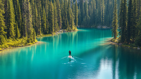 water sports (kayaking, paddleboarding, surfing) enthusiast enjoying the view of a serene lake, created with generative ai