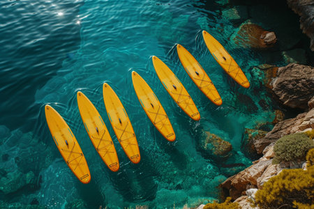 Aerial view of group of kayakers in body of water. Generative AI.