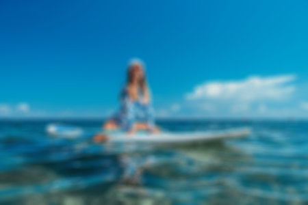 Close-up of a girl doing yoga on sub board. Psychology meditation, relaxation and self-healing concept. Lonely woman alone on board against a background of water and a pier. Stand up paddle boarding