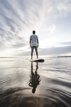 Standup paddleboarding at dawn, tranquil waters, balanced, serene adventure