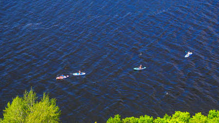 Caucasian woman riding a SUP board on the lake. View from above. Summer sport