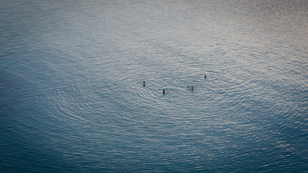 Group of people on stand up paddle board at blue sea. People on Sup board in Mediterranean sea. Aerial view