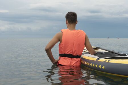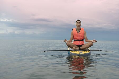 Surf man in life jacket does yoga and meditation on a sup surfboard, Concept safety on the water
