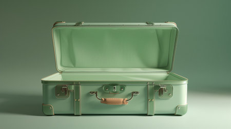 This image features a vintage leather suitcase adorned with a brass lock and handle, set against a textured green backdrop. It evokes nostalgia and adventure.