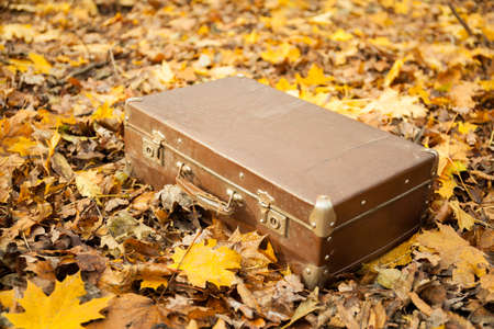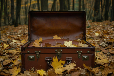 Open brown suitcase lies amidst fallen leaves in a serene autumnal forest