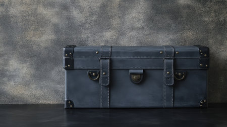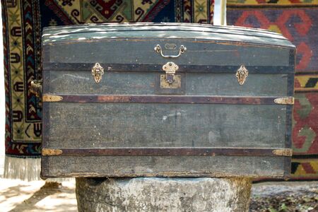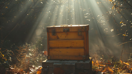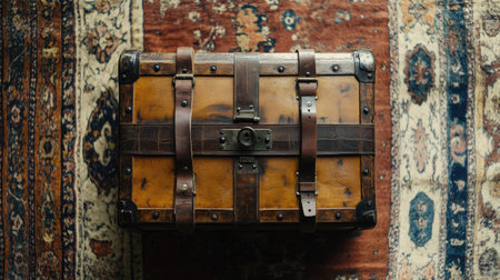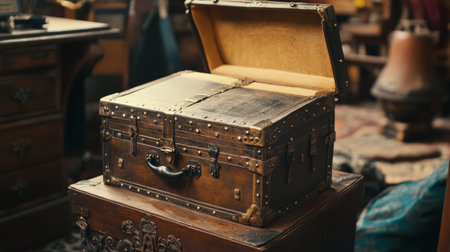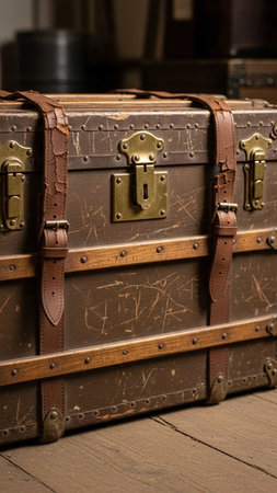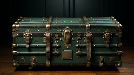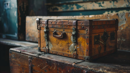 A beautifully aged wooden trunk with metal accents, showcased in a rustic environment with weathered textures, reflecting historical charm.