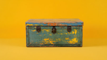 This image features a vintage wooden box with a colorful distressed finish. The bright yellow background enhances its charming rustic appeal, making it ideal for various design projects.