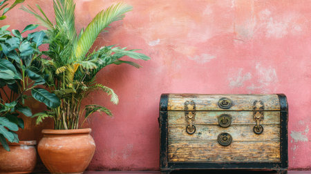 This image showcases a vintage wooden chest with intricate detailing, set against a textured pink wall, complemented by a lush green plant for a cozy ambiance.